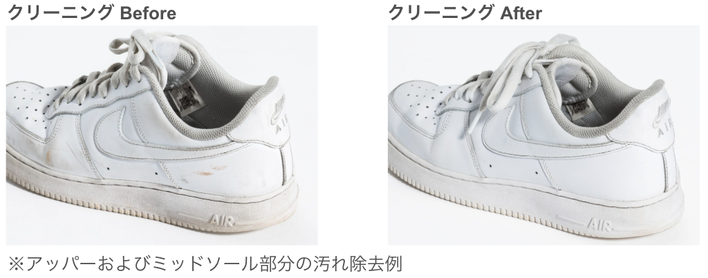 ※比較画像は一例です。出品者の撮影環境やスニーカーの素材・使用状況によって、クリーニング後の見た目や仕上がりには個体差がありますので、あらかじめご了承ください