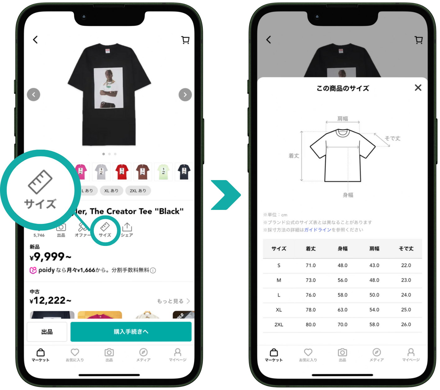 商品ページの「サイズ」をタップしていただくと、各サイズごとの採寸表をご確認いただけます。