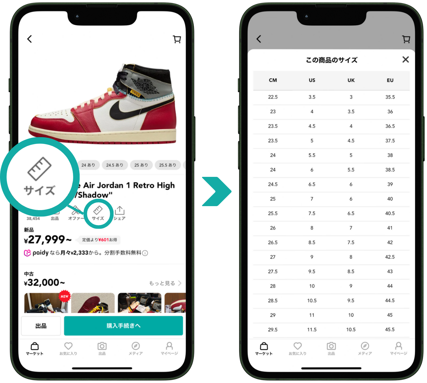 商品ページの「サイズ」をタップしていただくと、規格別サイズ換算表をご確認いただけます。
