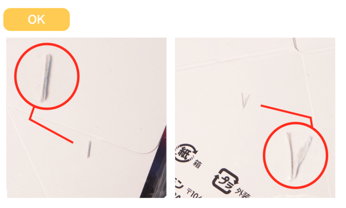 輸送や保管の過程でミシン目部分にわずかな開きが生じることがあるため、最大1cm未満のミシン目の開きについてはガイドライン基準を満たすものといたします。