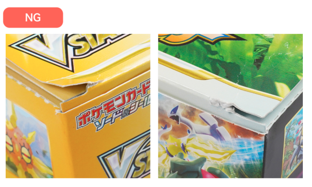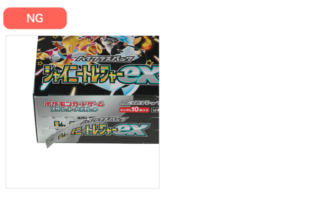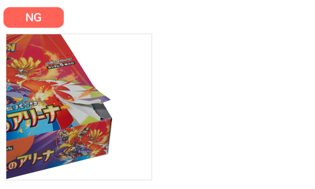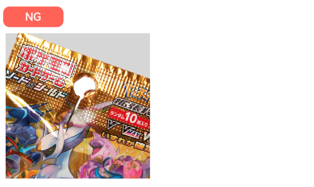 開封の痕跡や袋に一部でも破れが生じている商品は、中身(カード)のすり替えが可能なことから、ガイドライン基準を満たしていないと判断いたします。