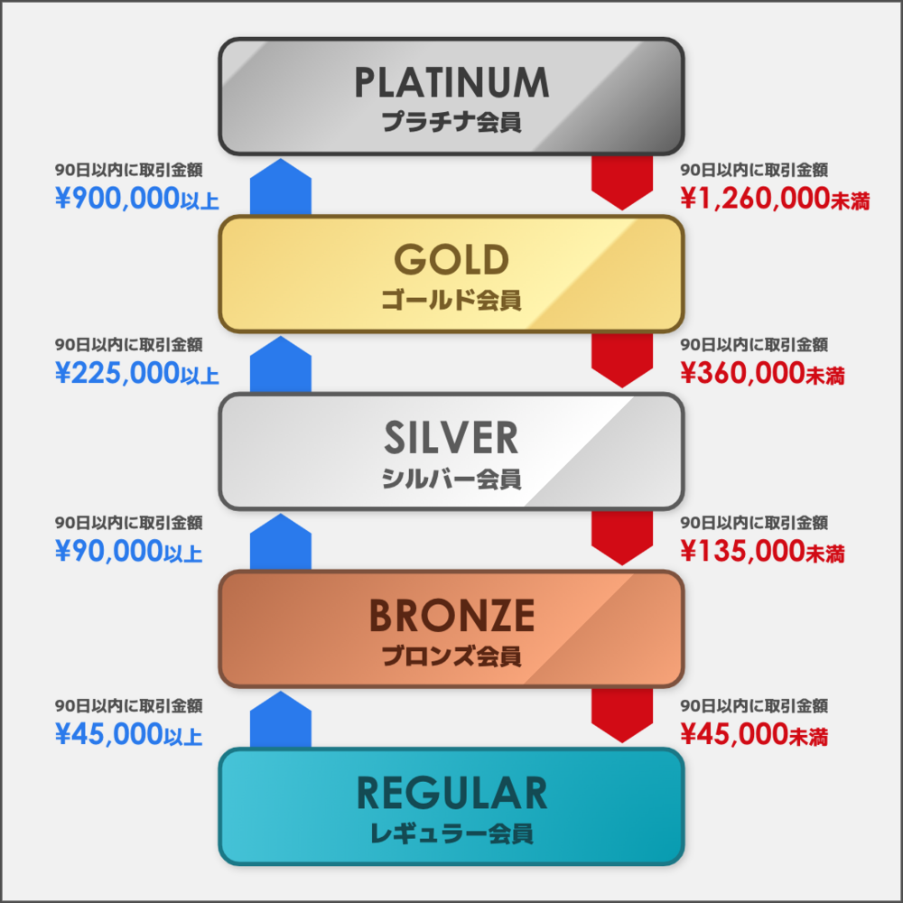 ランクは5段階に分かれており、ランク獲得日以降に完了した取引金額の合計値に応じて、保有ランクが確定します。