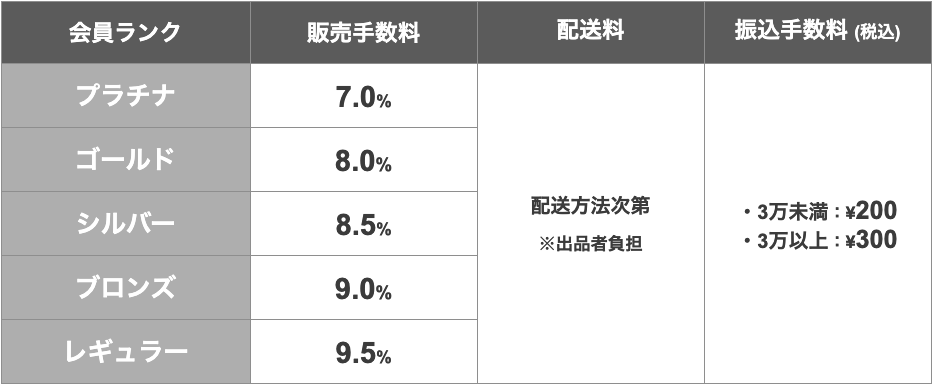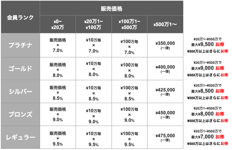 販売金額が20万円を超える場合、会員ランクに応じた一定金額毎の手数料が適用されます。