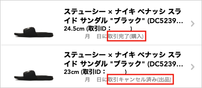 一覧画面から、完了時の取引ステータスと出品・購入どちらで成立した取引を確認することができます。