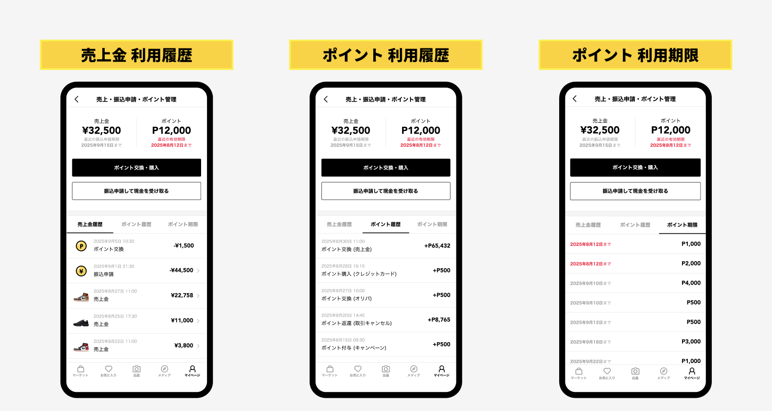 ポイント残高や有効期限は、「マイページ」→「売上・振込申請・ポイント管理」から確認できます。