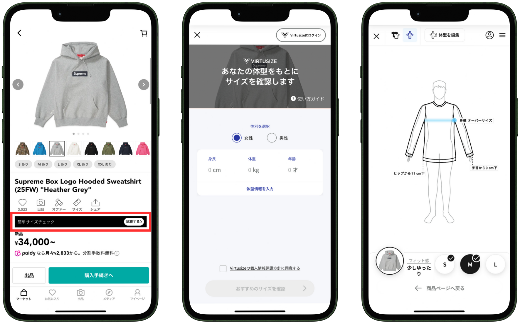 Virtusizeはご自分のボディシルエットやお手持ちのアイテムと比較して、オンライン試着ができるサービスです。